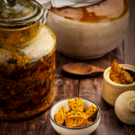 Handcrafted South Indian pickles, made with gingelly oil, rock salt, and time-honored recipes.